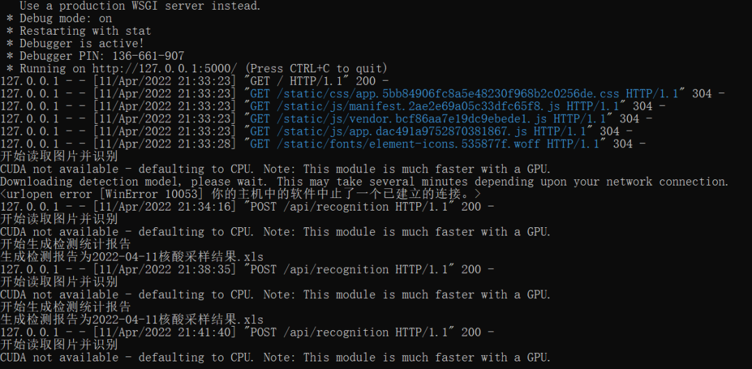 前端页面使用Vue.js框架实现,利用Element组件库,创建了批量上传核酸检测图片的用户界面,在用户点击“开始识别”按钮后,页面发起请求,并将文件列表传递给后端。在后端逻辑上,基于实现好的OCR脚本,稍加修改并暴露所需调用的函数,采用Flask框架作为本地服务器,响应页面请求并启动识别进程。整个项目代码在Python环境下进行简单配置,即可在本机上复现运行。打开浏览器访问本地端口便能选取文件进行识别,识别结果将以Excel文件形式自动导出至项目目录下。