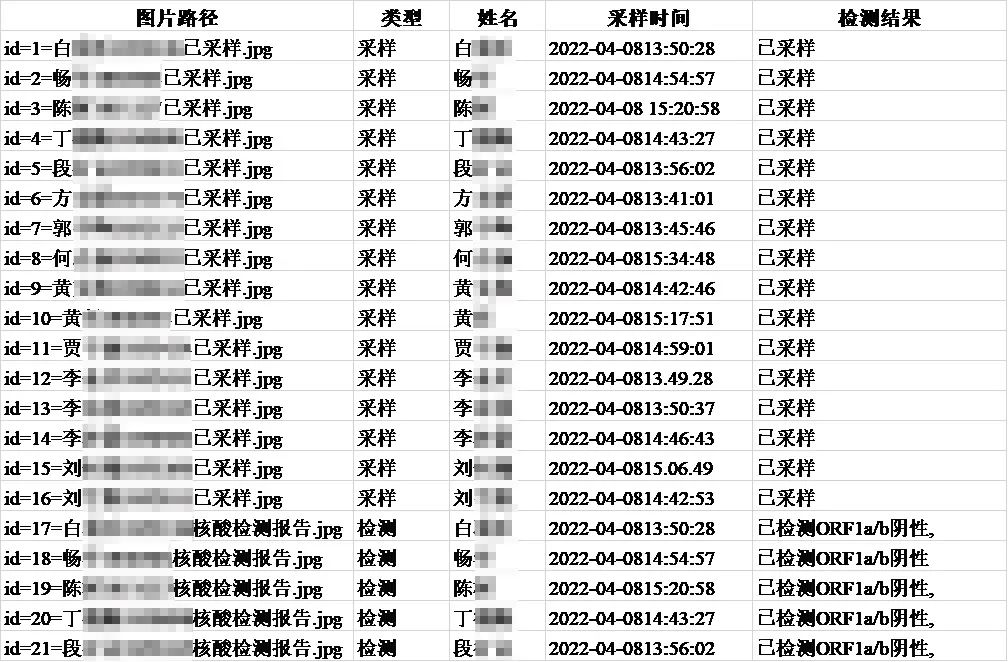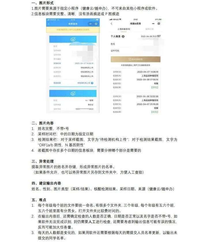 刚开始的几天,按照公司要求,每位同学在做完核酸后,需要按时上交采样的截图,结果出来后,也需要上交检测结果的截图。由于核酸检测较为密集,且每次核酸结果出来时间长短不一,导致很多同学上传了错误的截图。有的同学将本该上传的核酸检测结果图上传成了核酸检测图,有的同学看错了采样时间和检测时间,上传了上次的核酸检测结果。