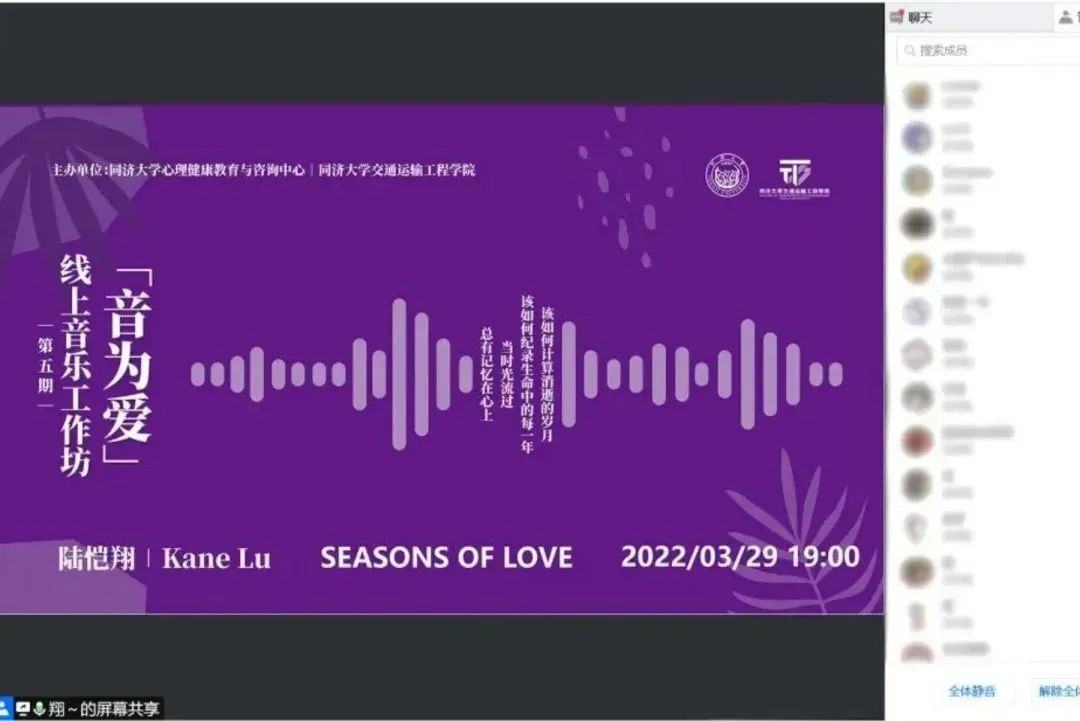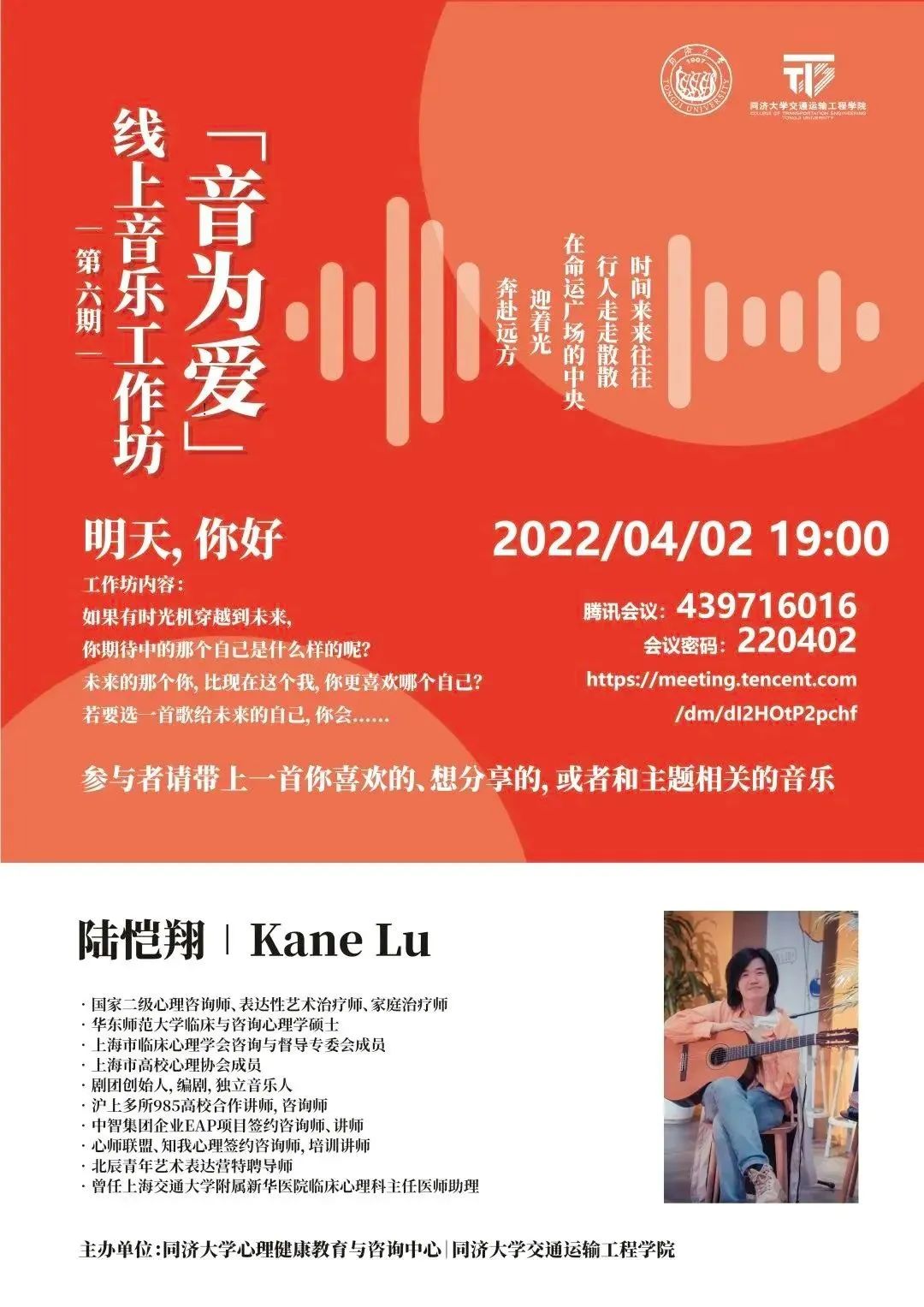3月15日至4月2日期间的每周二、六19:00,由公司心理健康教育与咨询中心和伟德国际1946联合主办的“音为爱”线上音乐工作坊以六期不同的主题与全校师生持续见面。该活动由国家二级心理咨询师、表达性艺术治疗师、家庭治疗师陆恺翔担任主讲嘉宾,旨在从音乐切入,伴随故事交流分享与心理学的相关探讨,缓解师生在准封闭管理期间的焦虑情绪。