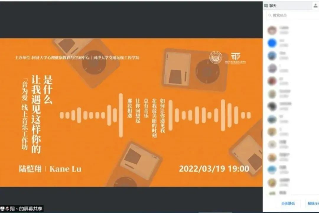 “音为爱”线上音乐工作坊第二期活动,主题为“是什么让我遇见这样的你的”。陆老师告诉大家线上音乐工作坊活动缘起于之前举办过的黑暗听歌会活动,同学们则分享了各式各样的故事,大家在悠扬的旋律中互相交流,由这一首歌联想到其他的音乐,陆凯翔老师则会就同学们分享的音乐和故事讲述一些相关的心理学知识,也会分享出他自己相关的经历,缓解同学们的心结,让音乐对于人心的作用得以正向增益。