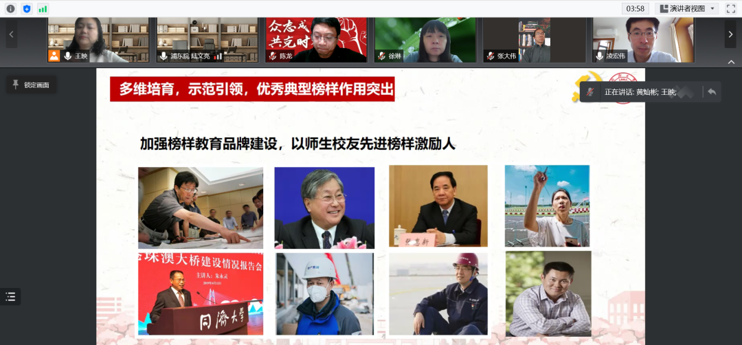 之后由黄灿彬副书记汇报公司的党建工作,他从“筑基”“引领”“示范”“双优”四个方面详细阐述公司党建工作特色。近年来,公司党委取得了2021年“上海市教卫党委先进基层党组织”、2022年教育部新时代高公司党建“双创”工作标杆院系等称号,也涌现了一批先进集体和个人:朱兴一教授获“全国优秀党务工作者”称号;杨东援教授获“2021年中国交通教育终身成就奖”;马明杰博士获全国高校“研究生党员标兵”称号。这些荣誉一方面是对公司党建工作成效的充分肯定,另一方面也体现公司“三全育人”“多维培养”的人才培养模式取得的丰硕成果。黄书记表示公司培养人才的目的就是为了输送给像浦东院这样的优质单位,让其充分发挥所学报效社会和国家。