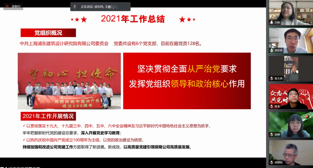 随后浦东建筑设计研究院总经理助理、市政交规院凌宏伟经理从2021年主要工作、2022年工作目标、现阶段工作重心等方面介绍了浦东院的党建工作。凌经理谈到:作为伴随着浦东开发开放成长起来的国企,这三十多年来公司取得了飞速发展,获得了16届的“上海市文明单位”,“上海市高新技术企业”等称号,也有很多集体和个人获得了表彰。这些荣誉的取得和党建工作的扎实推进分不开。接着凌经理从治理架构、人才培养、党风廉政、特色党建等方面详细阐述了浦东院的党建工作,又从保持各种荣誉和称号、争创一系列荣誉、培养优秀党务工作者等方面介绍了浦东院2022年党建工作的目标。在近期党建工作的介绍中他提到目前单位的128名党员全部在社区报到,并大量参与到一线抗疫志愿服务工作中。公司作为浦东新区建设企业也积极参与到市区应急隔离点项目的建设和机场的转运工作中。最后凌经理希望加强与公司的党建联建工作,进一步开展阶梯式共建,加强科研合作,联合培养人才。