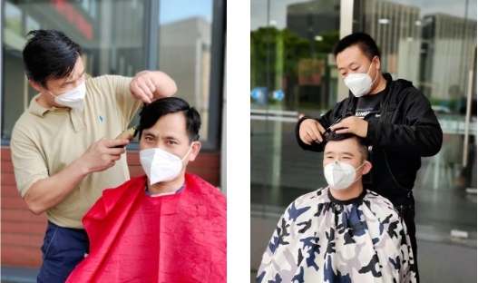 这些留守在通达馆的老师们,生活更为不便,睡觉只能打地铺或者是行军床,洗漱只能依靠洗漱间简单的擦拭。即便如此,在完成公司的多项志愿工作之外,一些老师也趁此机会,各显身手,展露不一样的风采技能。肖飞鹏教授和王同宇老师在闲暇之余化身托尼老师给留守在公司的教职工还有后勤人员理发,大家在通达馆内守望相助,携手同行。后续还有更多的老师积极响应,排除家庭困难,进一步做好校内服务人员的补充工作。