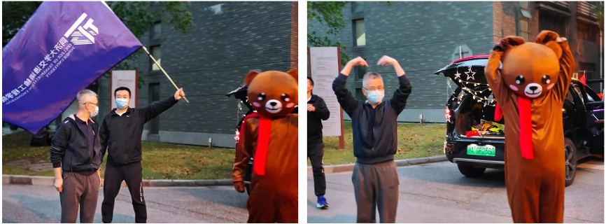 日前,凌经理还带领公司的教职工及后勤职工们一起加入到健步走活动当中,他们化身为小熊,开着车载音乐,摇摆着公司的旗子,成为了健步走活动中最受欢迎的氛围组!从视频里还能再次感受到公司老师们为员工们健步走营造的活跃气氛。让我们一起加油,迎接解封的胜利!