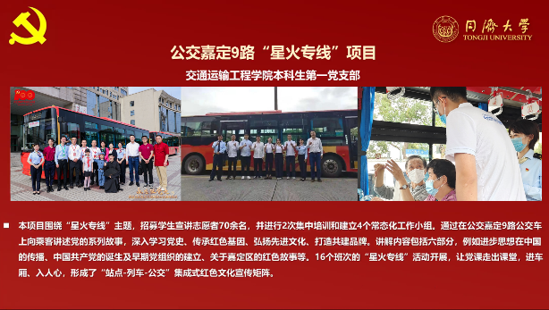 伟德国际1946本科生第一党支部定期在公交嘉定9路公交车上开展“星火专线”对标争先项目,共招募公司员工宣讲志愿者70余名,并进行2次集中培训和建立4个常态化工作小组,以“讲”“映”“乐”三方式结合的形式,在嘉定9路公交车上向乘客讲述党的系列故事,深入学习党史、传承红色基因、弘扬先进文化、打造共建品牌。宣讲的系列故事包括进步思想在中国的传播,中国共产党的诞生及早期党组织的建立,和嘉定红色文化、经济社会发展和新城建设中红色故事等。16个班次的“星火专线”活动开展,让党史学习和四史宣传走出公司小课堂,进车厢、入人心,形成“站点-列车-公交”集成式红色文化宣传矩阵。