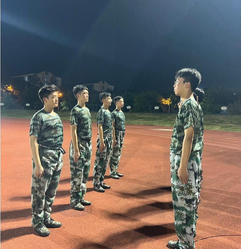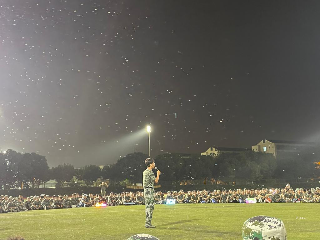 清风拂过良夜,训练了一整天的同学们围成一圈,观看由同学们精心排练的文艺晚会,从充满青春感的《想去海边》到诉说人生理想的《海阔天空》;从一曲打动你我的《平凡之路》到经典复刻的“鸡汤来咯”;再从欢乐整活的“只因你太美”到教官深情演唱的《江南》。璀璨的星空下,同学们挥舞着荧光棒,应和着中央演出的同学,一时间竟比头顶的星空更加耀眼。短短一小时的文艺演出,展现了同学们积极活泼的风貌和满满的正能量,亦体现了同学们特长的百花齐放,为这最忙碌的一天画上了完美的句号。