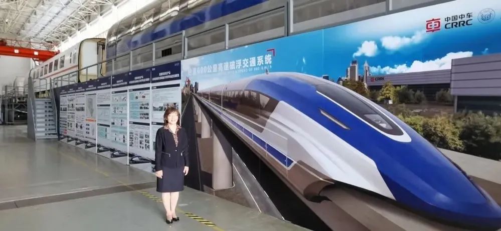 陈小鸿站在“时速600公里高速磁浮交通系统“展板前