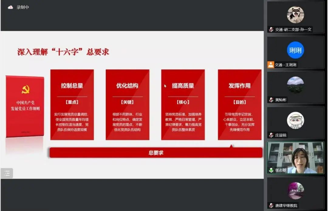 张志敏分别从“党员队伍大数据”和“发展党员工作大事记”两方面介绍了党内及公司的党员基本数据情况,梳理了历史上党员发展的脉络和情况,深入解读了党员发展工作中的“十六字”总要求:控制总量、优化结构、提高质量、发挥作用。同时,根据党员发展工作流程的五个阶段,从递交入党申请书到成为入党积极分子、发展对象、预备党员、正式党员,张志敏强调了对程序要求和时间要求等结合相关材料进行了详细解读。