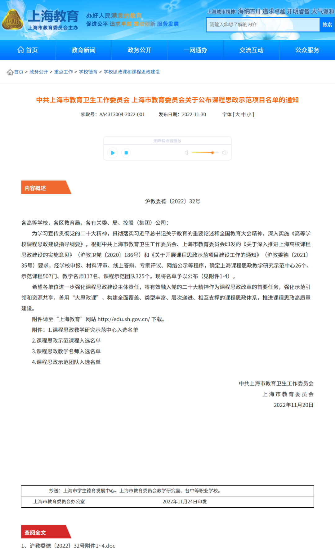 11月30日,中共上海市教育卫生工作委员会、上海市教育委员会公布课程思政示范项目名单,确定上海课程思政教学研究示范中心26个、示范课程507门、教学名师117名、课程示范团队325个。
