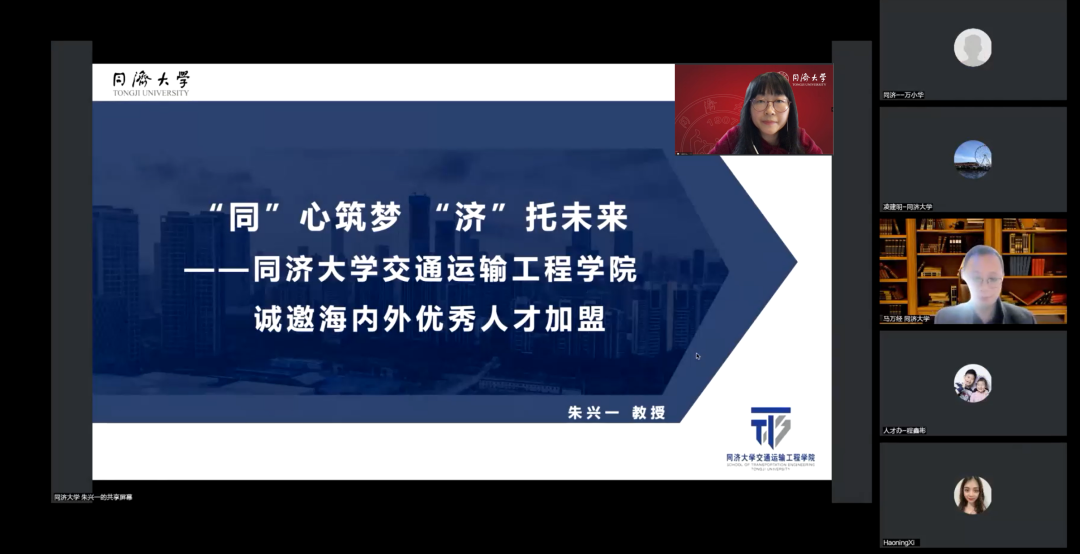 朱兴一教授作人才项目的基本情况和申报流程介绍。她指出,国家级和上海地区人才项目旨在吸引和鼓励在自然科学、工程技术等方面已取得较好成绩的海外优秀青年学者回国工作,为科技强国建设贡献力量,随后介绍了相关人才项目申请人的年龄、学历、研究方向、工作经历等申请要求及具体的申请流程和相应的时间节点,并诚挚地欢迎各位优秀人才加盟同济交通。