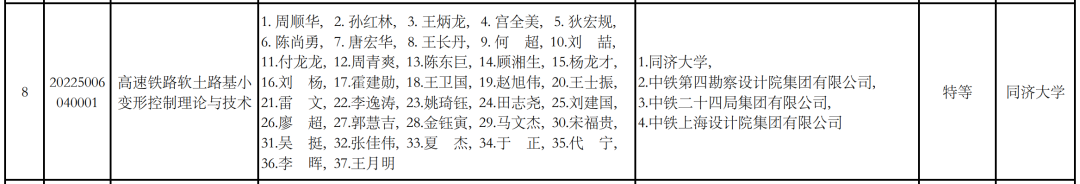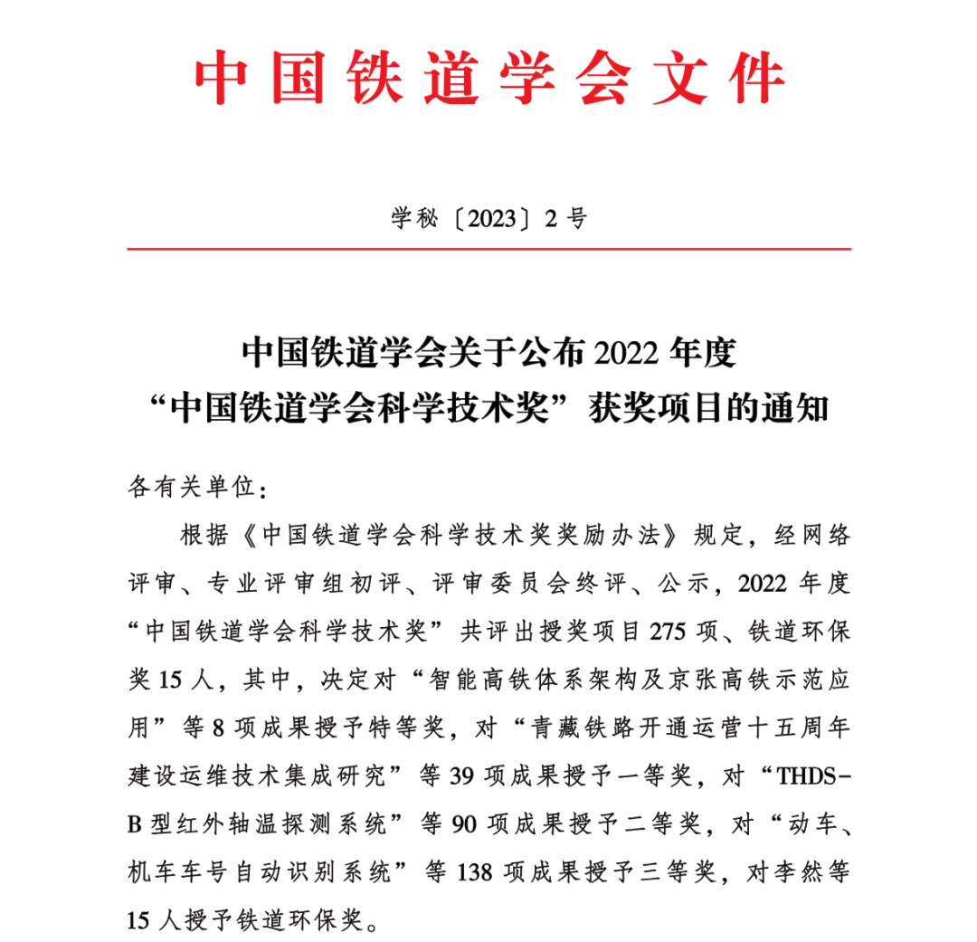 “中国铁道学会科学技术奖”是我国铁路行业科技最高奖项,每两年评选一次,评审面向全国参与铁路行业的所有投资建设单位、科研院所、铁路局、设计院、施工单位等。经专业组网评、专业评审组初评、评审委员会终评审定,授予2022年度“中国铁道学会科学技术奖”特等奖8项、一等奖39项、二等奖90项、三等奖138项。