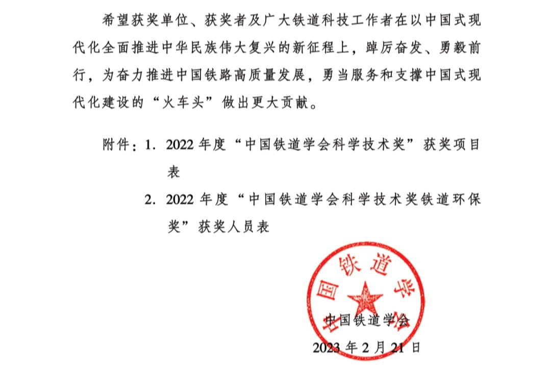 2023年2月23日,中国铁道学会正式公布2022年度“中国铁道学会科学技术奖”获奖项目名单,公司成绩斐然,共有6项成果获奖。