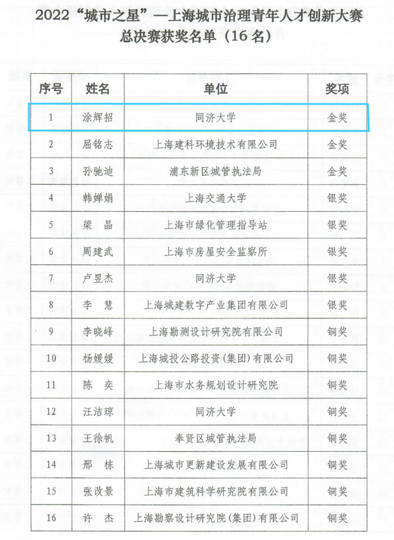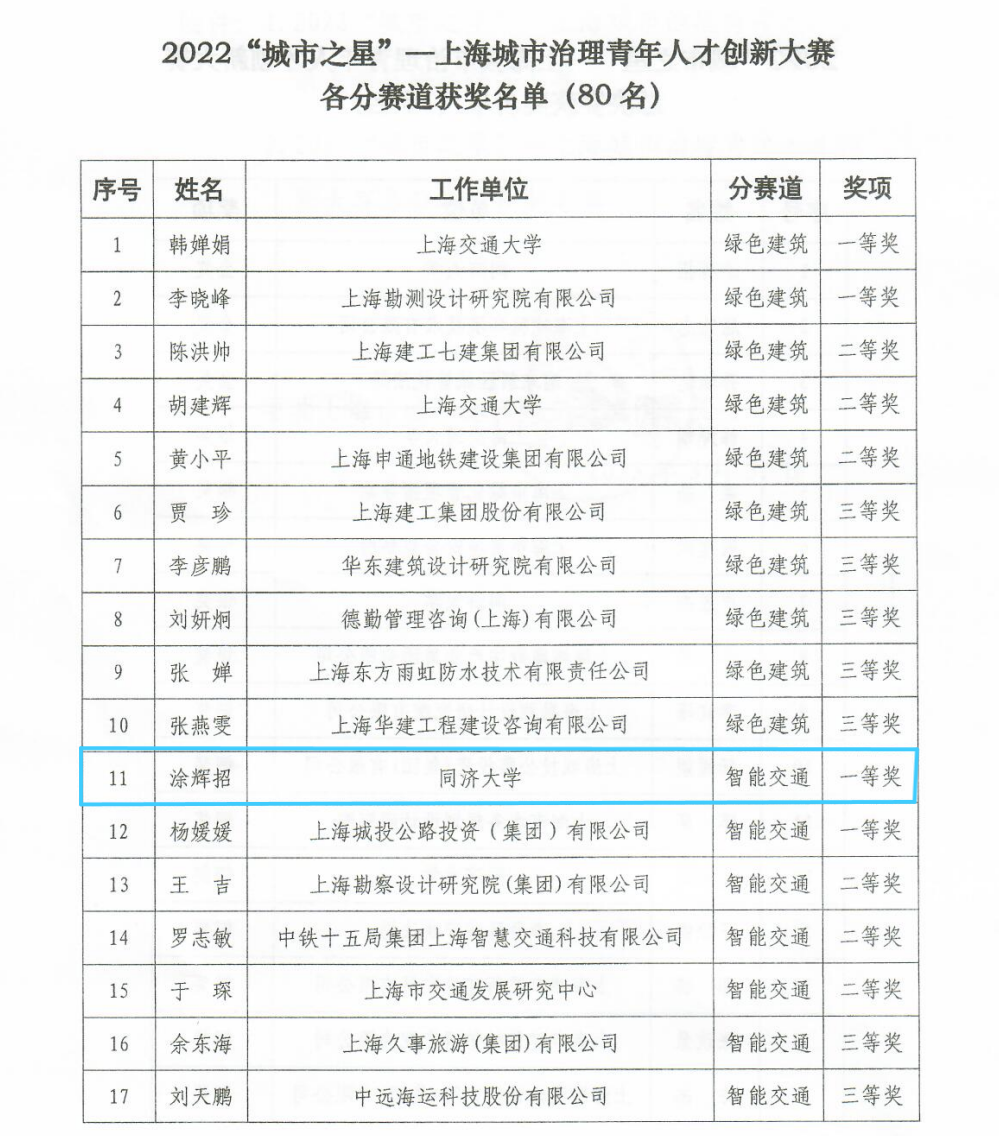 大赛自2022年10月启动,共有来自城市治理各相关领域的609名青年人才报名参赛,经过分赛道初赛、复赛、决赛,涂辉招荣获上海城市治理青年人才创新大赛总决赛金奖和智能交通分赛道一等奖。