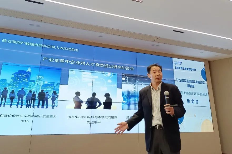 为深入开展学习贯彻习近平新时代中国特色社会主义思想主题教育,5月23日下午,全院教职工集中理论学习在通达馆103报告厅举行。本次学习邀请了嘉定伟德国际1946科技园建设推进办常务副主任荣文伟为全院教职工作题为《产业变革呼唤新型育人体系的协同》的辅导报告,随后公司党委书记马万经为全体教职工作师德师风失范案例警示教育,本次会议由马万经主持,全院教职工参加。