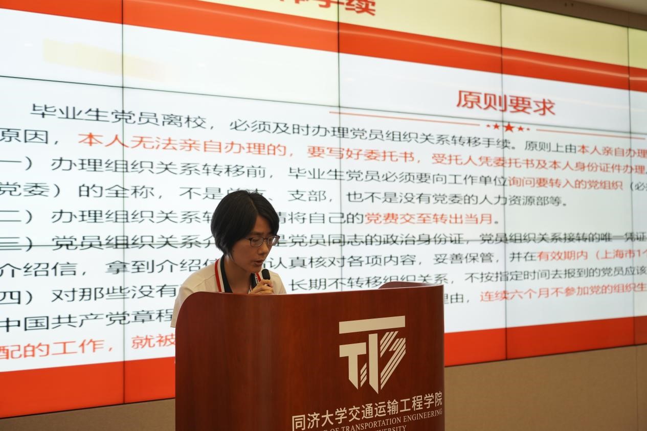 王琍琍强调了党组织关系转接的重要性并为毕业生党员讲解党组织关系转接的流程。她针对以往转接组织关系过程中出现的常见问题进行了提醒和说明,要求各支部书记当好第一责任人督促毕业生党员做到党组织关系转接信息核实到位、程序规范到位、告知提醒到位,确保顺利完成毕业生党员组织关系的转接工作。