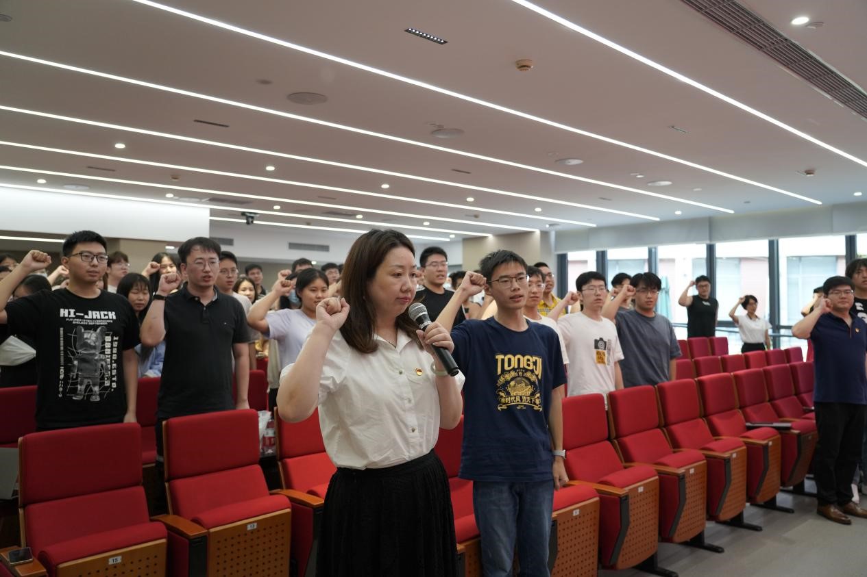 黄泽蓉带领全体毕业生党员重温入党誓词,党员同志面向党旗庄严宣誓,在铮铮誓言中重温入党初心,坚定理想信念,牢记职责使命。