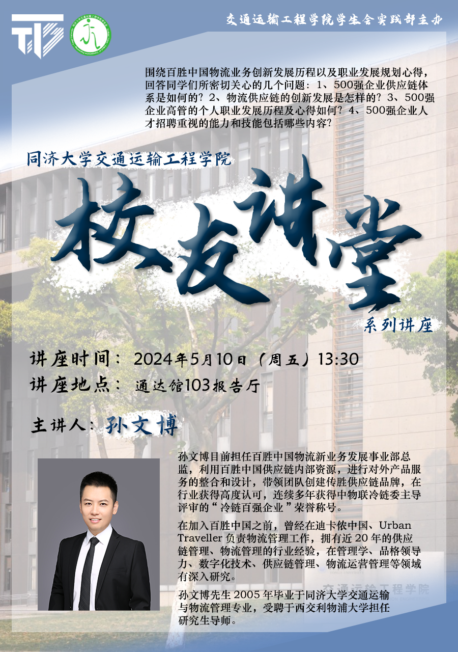 主讲人:孙文博目前担任百胜中国物流新业务发展事业部总监,利用百胜中国供应链内部资源,进行对外产品服务的整合和设计,带领团队创建传胜供应链品牌,在行业获得高度认可,连续多年获得中物联冷链委主导评审的“冷链百强企业”荣誉称号;在加入百胜中国之前,曾经在迪卡侬中国、Urban Traveller负责物流管理工作,拥有近20年的供应链管理、物流管理的行业经验,在管理学、品格领导力、数字化技术、供应链管理、物流运营管理等领域有深入研究;孙文博先生2005年毕业于伟德国际1946交通运输与物流管理专业,受聘于西交利物浦大学担任研究生导师。