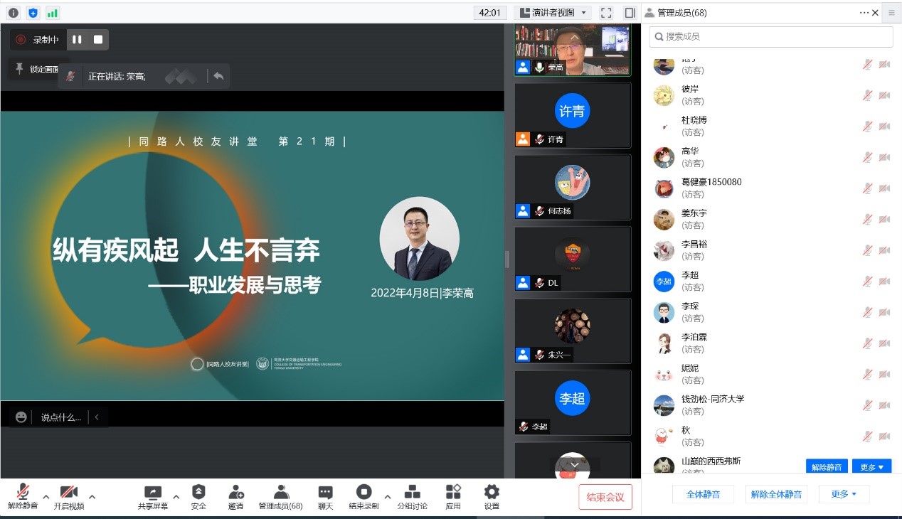 讲座伊始,李荣高员工提到了当前“毕业季”与“疫情防控”的背景,表达了同济人在任何环境中都会勇往直前的风格,尤其是同路人“逢山开路,遇水架桥”的精神,希望同学们在特殊时期多多思考,提升自己。