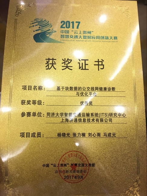 2017中国“云上贵州”智慧交通大数据应用创新大赛于5月启动,收到了来自全国、港澳台地区、及美、英等国的报名项目535个,杨晓光教授指导其员工完成的作品——“基于块数据的公交线网健康诊断与优化平台”荣获优秀奖。