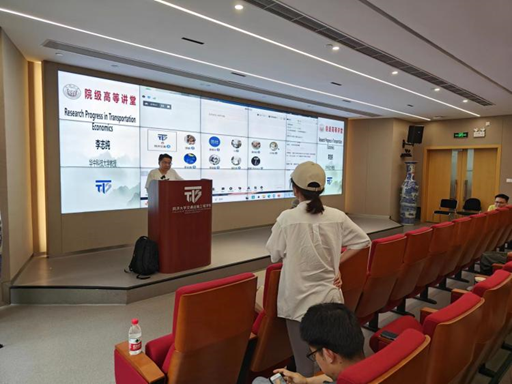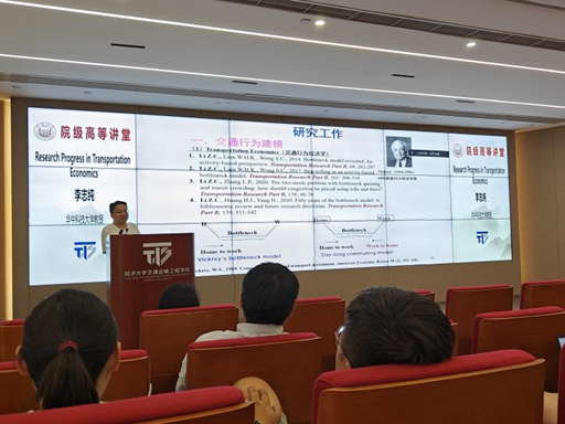 首先,李教授向我介绍了他主要的研究领域,围绕:交通行为建模、城市交通基础设施投资决策问题、交通需求管理(拥挤、排放税定价问题)、交通投资与城市经济和应急管理等方面向在座师生全面细致地介绍了研究进展和取得的成果,重点阐述了瓶颈模型动态分析方法、停车行为建模与停车设施设计、智能交通系统收益与风险评价、公共交通基础设施投资、交通信号设置、交通基础设施投资选址与维护、航空网络优化设计、航运网络优化设计等问题。