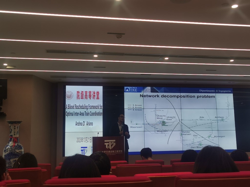 首先,Andrea D’Ariano向我们介绍了他主要的研究领域,围绕:Operation Research and Transportation向在座师生全面细致地这次演讲关注铁路调度员实时重新安排火车运行,通过最小化与离线时间表的偏差来调控各自调度区的交通,以限制干扰的传播。然而,一个地区所做的决策可能会影响其他地区列车时刻表的质量甚至可行性。区域控制中心协调多个地区的调度员工作,以在全局层面调控交通并避免全局不可行的情况。与调度员问题不同,尽管这一任务对于有效的交通管理至关重要,区域控制中心的协调活动仍未得到充分研究。