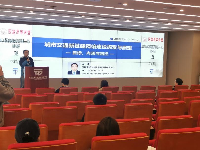 2023年11月30日下午14:00—15:30,高等讲堂在通达馆103成功举行。本次讲座特邀深圳市城市交通规划设计研究中心股份有限公司交通规划专业总工程师安健为在校师生作题为“城市交通新基建网络建设探索与展望——目标、内涵与路径”的精彩学术讲座。