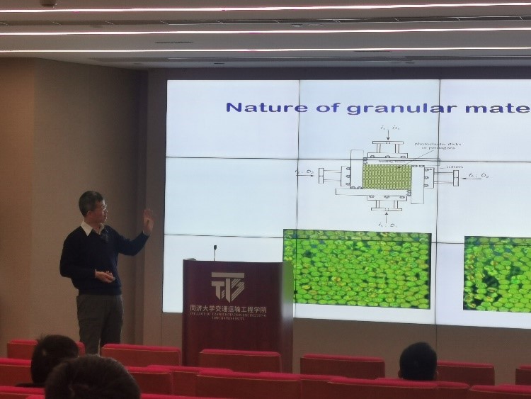 首先,Guo教授向大家介绍了他主要的研究领域,主要为高频、低振幅的振动对岩土结构的叠加作用,包括路基和子基。随后Guo教授介绍了他的团队近期的一项实验研究,揭示了由高频、低振幅振动引起的颗粒土的抗剪强度降低和附加体积变化。与砂土液化是由于饱和砂土在无排水条件下由过剩孔隙水压力引起有效应力减小不同,振动引起的抗剪强度降低与振动颗粒介质内部结构的变化有关。在极端情况下,这可能导致自然灾害,如地震时的滑坡触发、雪崩的发生,甚至是月球和火星上的干燥土壤长滑程滑坡。在岩土工程中,颗粒“断层仪”中的振动引起的抗剪强度降低被认为是地球物理学中地震的动态触发机制。