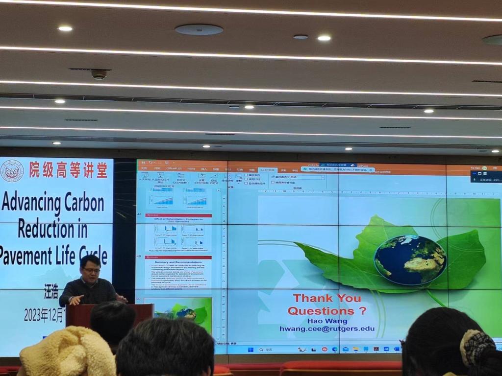 12月18日下午14:00-15:30,院级高等讲堂于伟德国际1946(通达馆)103会议室成功举行。本次讲座的主题为:Advancing Carbon Reduction in Pavement Life Cycle。讲座邀请了来自美国罗格斯新泽西州立大学土木与环境工程系教授和研究生项目主任的汪浩研究员为大家带来了精彩的报告。