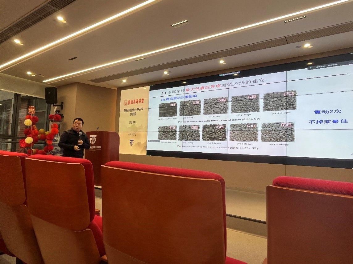 接着,张研究员介绍了透水混凝土在构建海绵城市的重要性,但其组成、结构设计方法多依据经验,难以避免淌浆和堵孔情况,导致透水混凝土力学性能普遍较差、透水系数较小,无法应用于力学或透水性能要求较高的领域。张研究员分析了透水混凝土性能影响因素,提出了避免淌浆、堵孔的最大包裹层厚度,并建立了相应测试方法。最后,张研究员还对于工程实践中遇到的许多实践问题进行了介绍,重点说明了各类混凝土技术在落地时的难点与实际工程问题的复杂性。