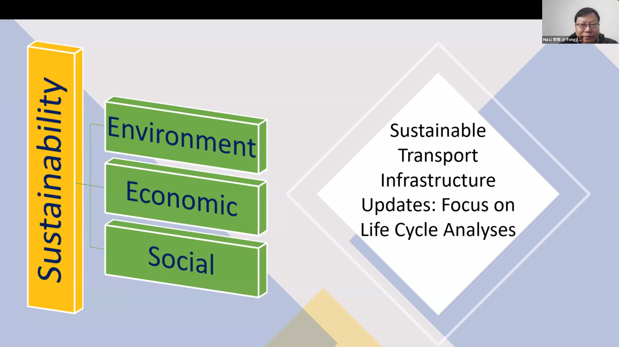 首先,Dr. Ali Butt介绍了什么是“真正的可持续性”——评估社会影响、经济影响和环境影响这三个要素(也称为可持续性的支柱或维度)的基础上,改善人类生活质量的途径。接着,Dr. Ali Butt结合交通领域,指出可持续的交通基础设施是指采用当今最有效的技术建造的经济型基础设施,通常(尽管不总是)消耗可再生资源和能源,排放最少的废气,使用寿命长,对社会和生态系统的影响最小。