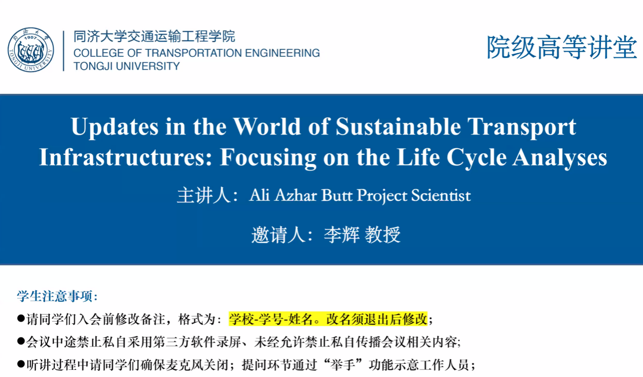 最后,Dr. Ali Butt回答了与会师生提出的关于低碳材料在交通领域中的应用、如何从使用阶段的角度评估交通设施生命周期以及地聚物混凝土在道路中的应用等问题,至此,本次讲座圆满结束。