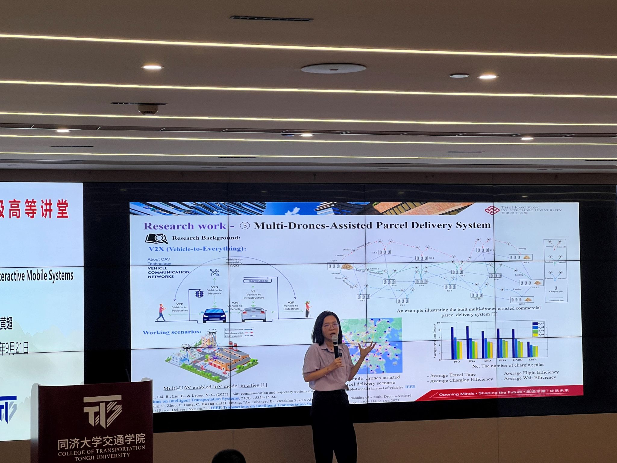 之后,黄超教授进一步深入地探讨了地面车辆的人机合作驾驶与完全自动驾驶,分析共享控制系统、路径规划及决策制定的最新研究进展与成果展示,通过向同学们介绍无人机与智能交通系统的前沿研究,为未来交通提供创新思路、提升用户体验与生产力。