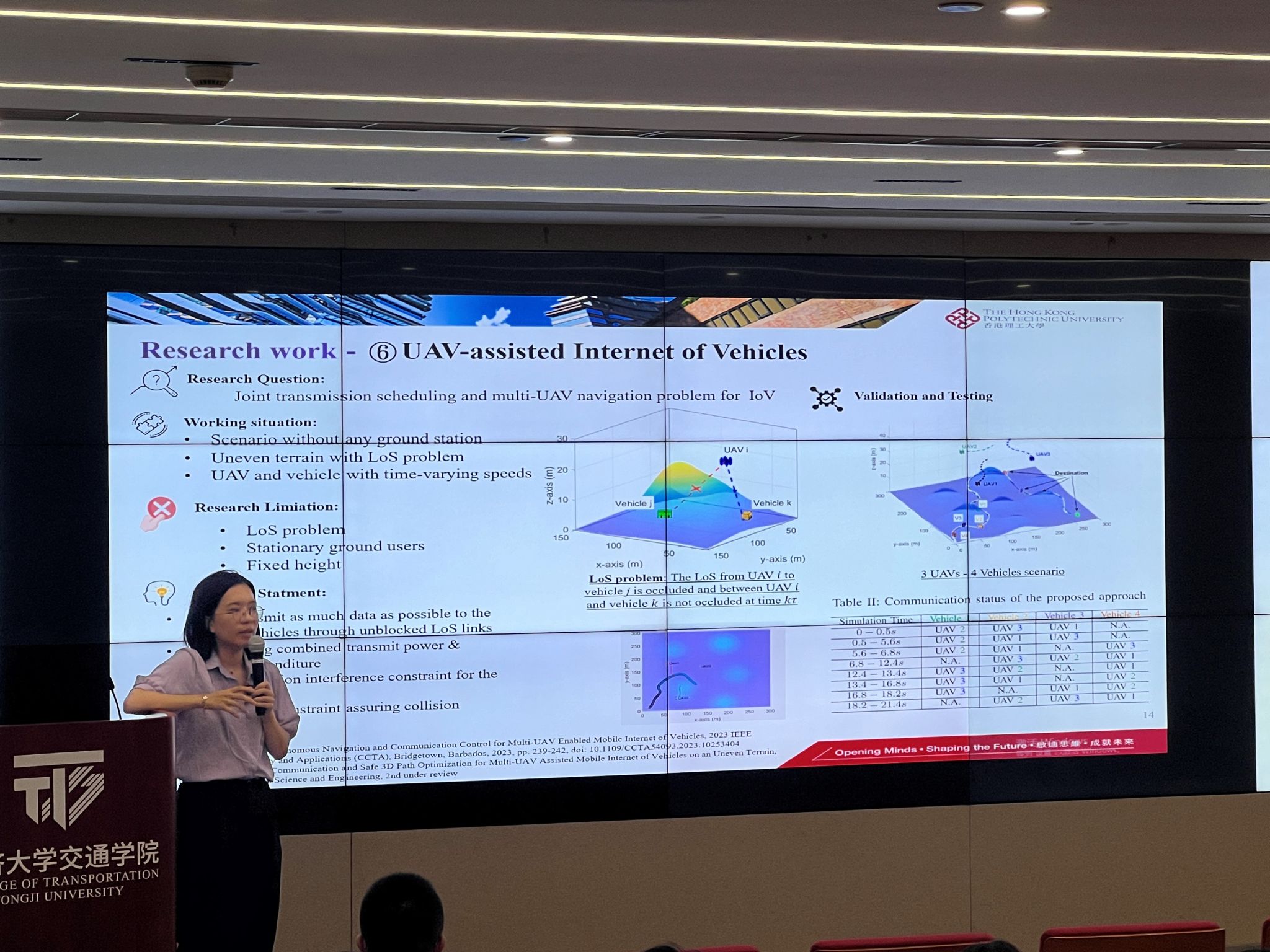 讲座中,黄超教授主要介绍了单一无人机(UAV)的研究,重点讨论了路径规划、轨迹设计及多无人机协作等多个方面,介绍了创新算法及实验成果。此外,还介绍了无人机与公共交通系统的结合应用,包括包裹递送及数据收集。