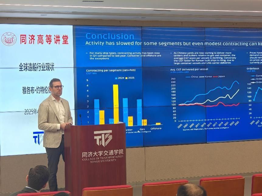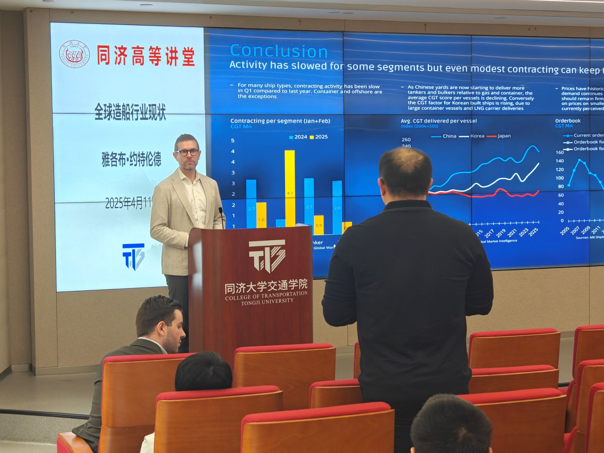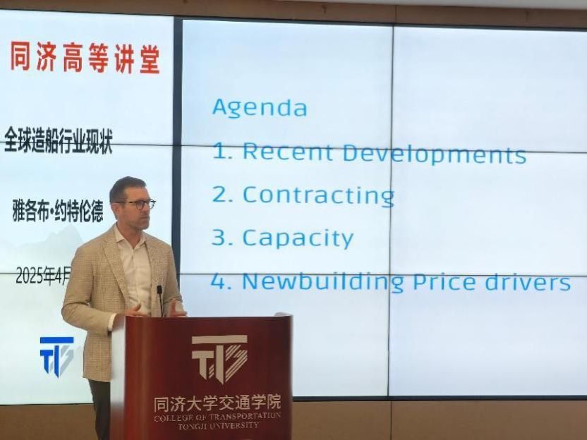 在本次“同济高等讲堂”上,雅各布·约特伦德先生以全球造船行业为切入点,深入分析了2025年初全球造船行业的发展现状,特别聚焦于亚洲主要造船国家的竞争格局。他详细探讨了合同签约活动和船厂行为对中、韩、日三国船厂市场份额变化的影响,揭示了亚洲造船业在全球市场中的动态调整与战略机遇。同时,讲座还深入剖析了影响造船价格的主要驱动因素,并结合行业数据对短期至中期的价格走势进行了前瞻性分析。雅各布·约特伦德先生凭借其丰富的行业经验和全球化视野,为与会者提供了关于造船行业未来发展的深刻洞见,探讨了如何在复杂的市场环境中优化资源配置、提升竞争力,并确保行业可持续发展。