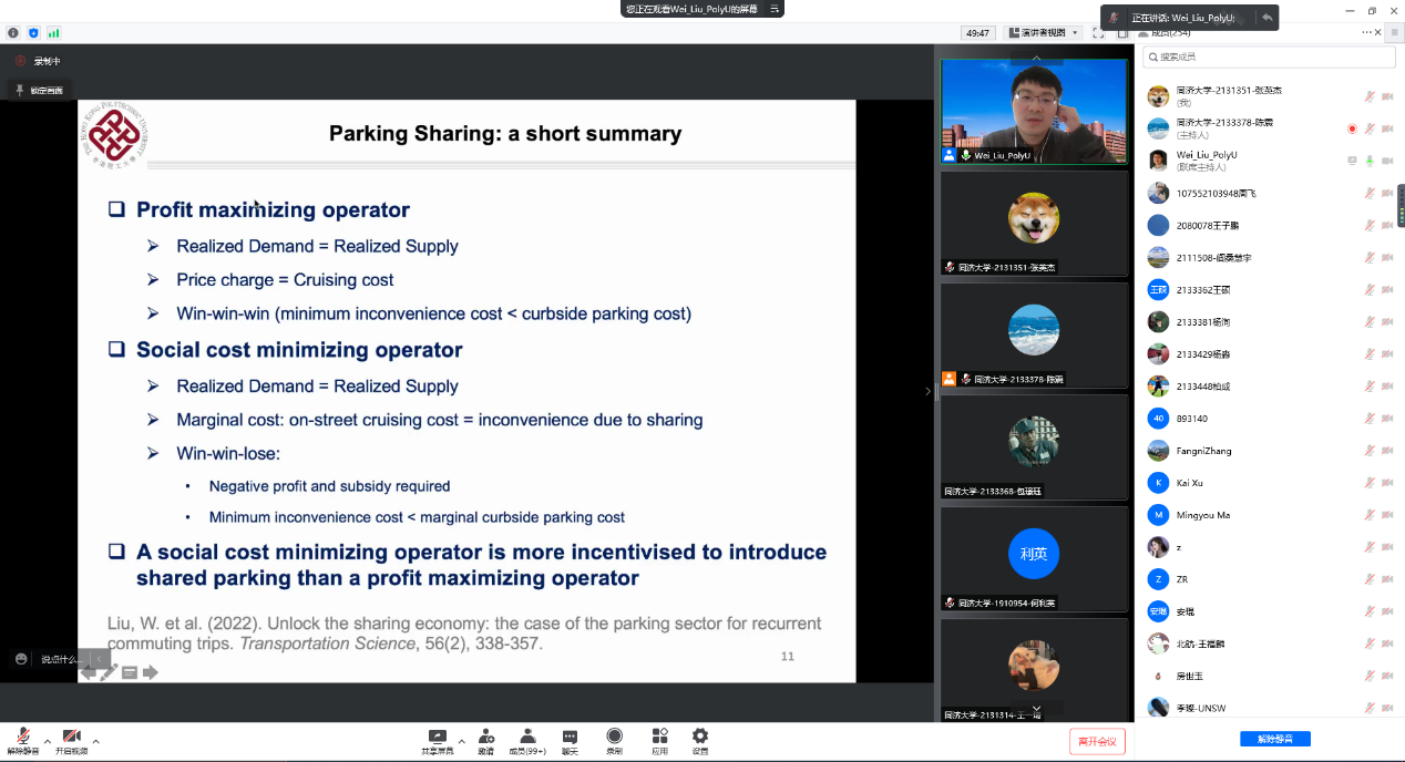 3月30日上午10:00-12:00,第481期同路人学术论坛于线上成功举行。本次论坛主题为“共享停车市场的建模与分析”,讲座由马万经老师邀请了香港理工大学航空及民航工程学系副教授刘威博士,为各位同路人分享在共享经济背景下,关于共享停车市场建模与分析的一系列最新研究成果。