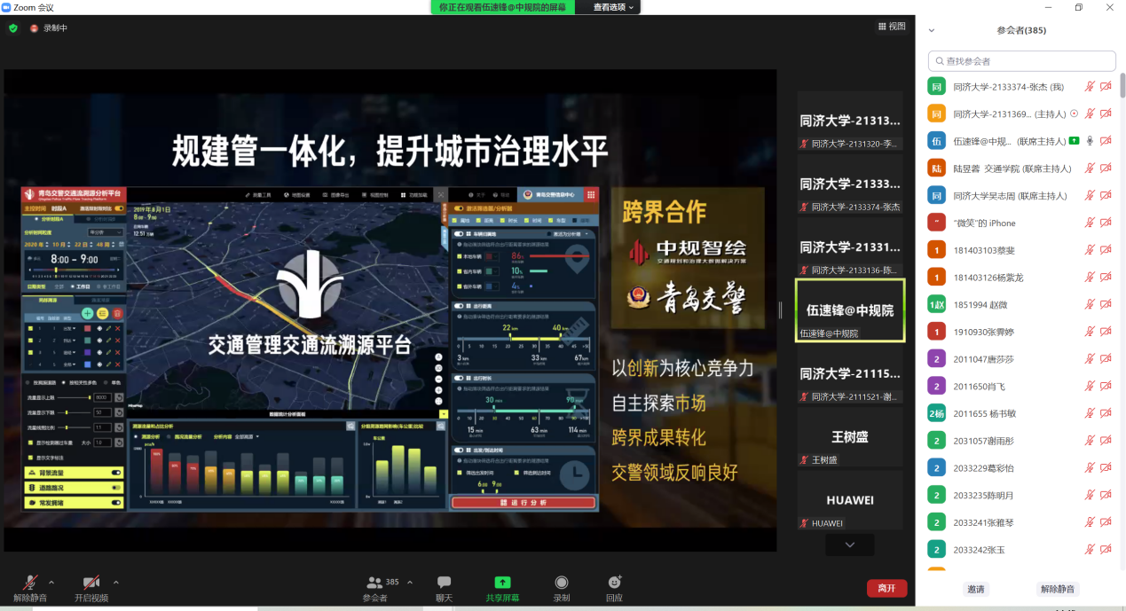 之后,伍速锋士就平台的交通预测辅助规划功能及云计算交通模型进行了讲解。平台通过综合OD和职住覆盖等关键因素,推演最佳建设时序;通过融合大数据、云计算和交通模型,大幅度降低了出行大数据使用门槛。就平台应用方面,伍速锋博士介绍了中规院与青岛交警的合作。该合作实现了基于大数据的全车型、全样本溯源。中规院的各平台可灵活自定义并长期进行道路运行规律分析,促进规建管一体化,提升城市治理水平。