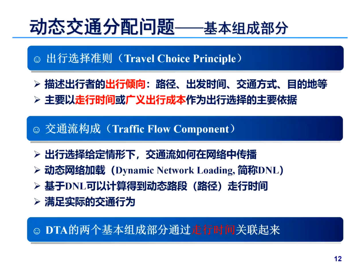 接下来龙教授介绍了动态交通分配问题的基本组成部分,主要包括出行选择准则以及交通流的构成,前者描述出行者的出行倾向,后者描述出行选择给定情景下,交通流如何在网络中传播。两个组成部分通过走行时间关联起来。
