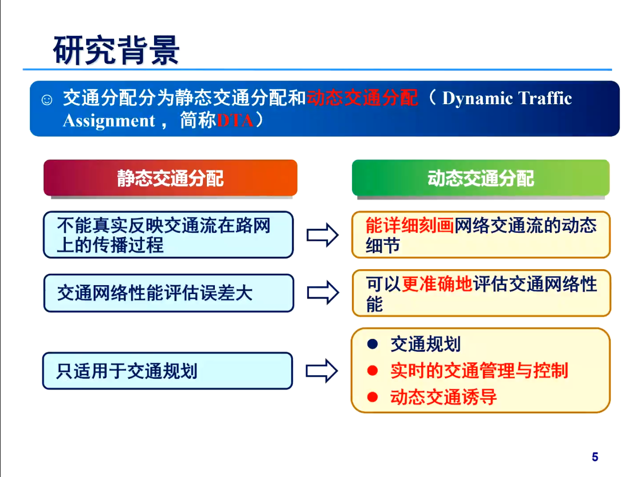 首先,龙教授介绍了动态交通分配(DTA)问题的研究背景,指出DTA能详细刻画网络交通流的动态细节、更准确地评估交通网络性能,做到实时的交通管理与控制、动态交通诱导。