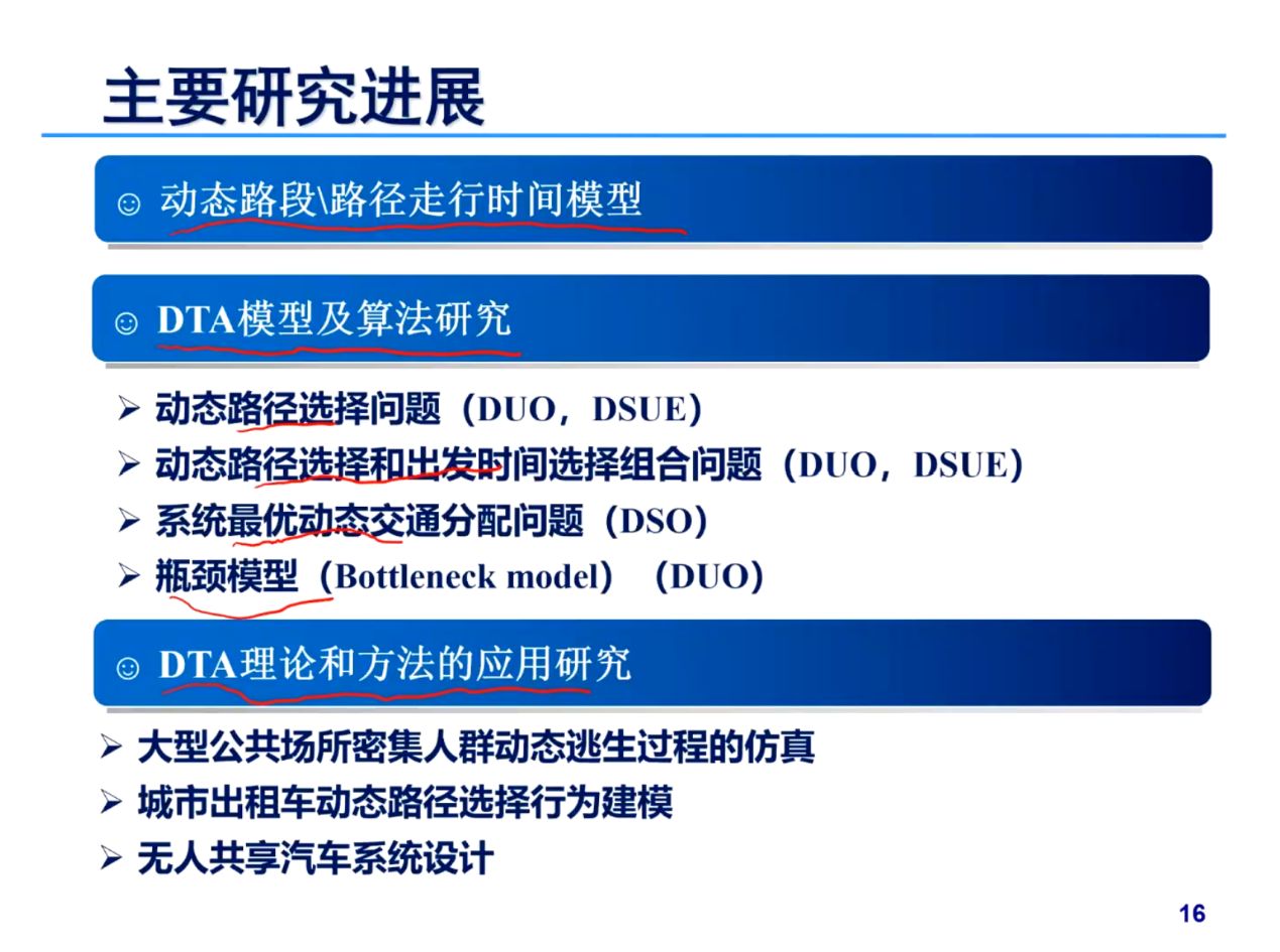 后续,龙教授又介绍了自己在DTA问题方面的研究进展,主要包括路径走行时间模型、DTA模型及算法以及相关的应用。