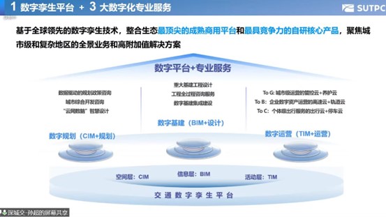 其次,孙博士向大家展示了深圳市城市交通规划设计研究中心构建基于全域的交通数字孪生平台的能力,可以为客户创造全周期核心价值,成为客户的数字管家。在空间层,以CIM技术为载体搭建多场景多精度的城市空间模型,已经覆盖了6000多公里的城市道路、419公里轨道运营里程。在信息层,基于BIM构件级建模技术,已经融入275个深圳各类BIM项目数据、100G建筑道路BIM模型。在活动层,基于TIM技术长期动态追踪人、车、轨全要素个体出行活动规律。