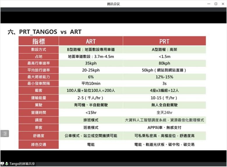 在建设方案层面,张教授采用包括占地、最高运行速率、载客量、最小发车时间等14个指标,具体说明了PRT的特质,并将PRT与传统ART进行对比,得出其更加便捷、高效与安全的优势。与此同时,张教授还列举PRT占地小、地形适应力强、造价低、景观效果好等六大工程化的优势。
