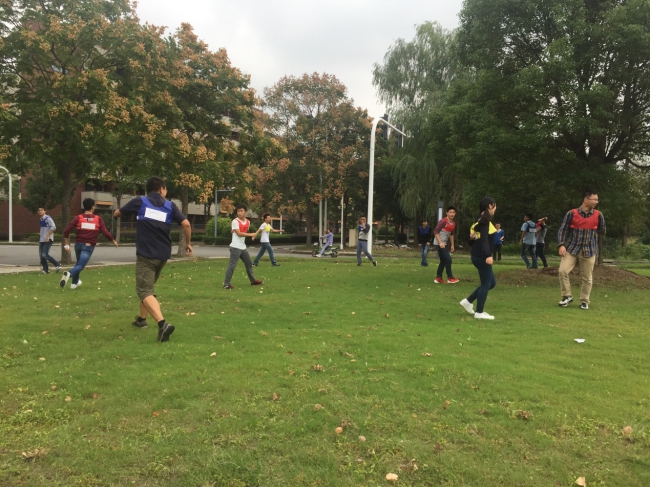 第三项游戏是“撕名牌”,这是一个让大家真正奔跑起来的游戏。游戏分三轮,每轮由一组队员成为被撕方,选定8人进入奔跑区域,另外两组各派出5人联合,共10人成为主撕方,名牌一旦被撕或者跑出区域范围,立刻出局。计分规则是每轮被撕方存活1人得1分,对方出局1人得2分。游戏进行过程可谓是惊心动魄,你追我赶,甚至有好几个同学是被追得不由自主地跑出了边界,强行出局,让人啼笑皆非。