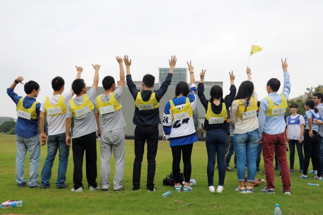上午阳光正好。在素质拓展活动在周隆主席正式宣布开始后,主持人对各位介绍这次活动内容,利用短时间的交流互动让同学们之间相互熟悉。接下来根据签到时的抽签结果将同学们随机分成了三组,三组成员分别开始了各自的队伍建设,在简单的互相介绍后,选定了队长并给自己队伍起了有趣的队名。在队伍展示环节中,小队队长挥舞着队旗,队员们齐声喊出队伍口号。