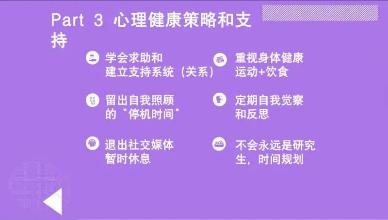 章秀明老师在讲座中表示研究生在读期间会面临着多方面的压力,需要多关注自己的心理健康。介绍了常见的心理疾病,并讲授了几种维持心理健康的的策略。