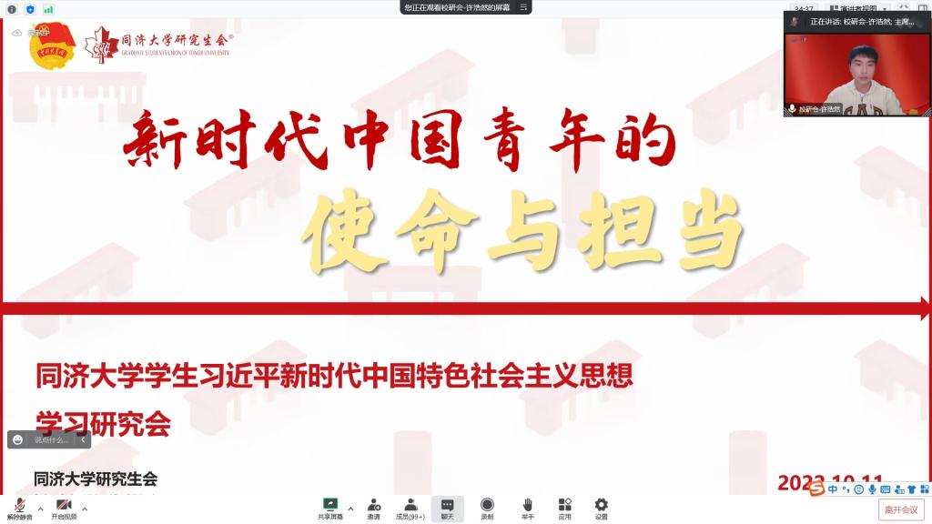许浩然同学首先向大家介绍了共青团成立的历史知识,以及共青团的初心和使命——坚定不移跟党走,为党和人民奋斗。接下来,介绍了我国领导人对于青年工作的关注,每年五四前后,习总书记都会发表关于青年工作的重要讲话,蕴含着对青年一代的殷切期待,同时,我国也印发了《新时代的中国青年》白皮书等相关文件。最后,许浩然同学号召大家学习习总书记讲话精神,肩负作为同济青年、中国青年的使命和担当,努力奋斗,报效祖国。