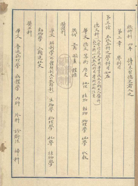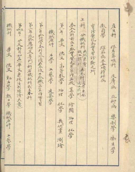 集团学科目分为德文科、医预科、医正科、工科等,其中工科分为机械科(机械兼电机工程科)和土木科(建筑兼铁道工程科)