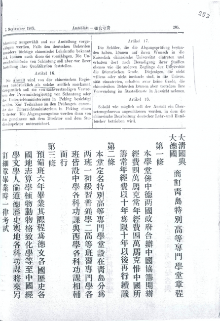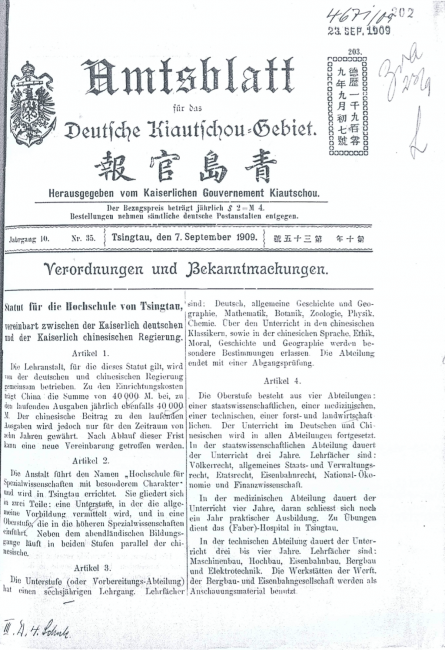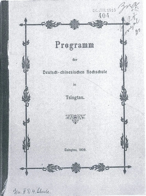 1909年9月12日,青岛特别高等专门学堂(Die Hochschule für Spezialwissenschaften mit besonderem Charakter in Tsingtau)正式开学,这所学堂也被称为青岛德华大学(Die Deutsch-chinesische Hochschule in Tsingtau)。该校是中德政府合办的第一所大学。
