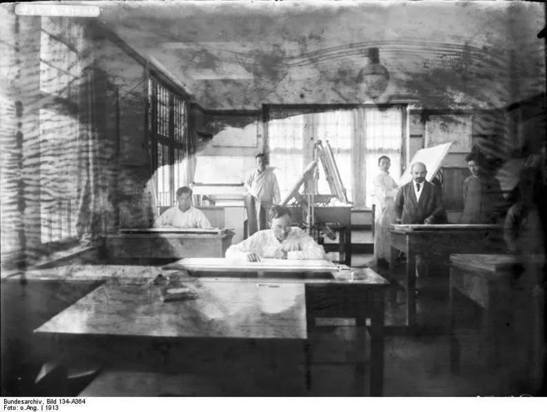 一战爆发前后(自1913年上学期结束至1919年2月),青岛德华大学员工共计145人【注2】,先后转移到上海同济医工学堂继续学业。其中对工艺科建筑班员工,同济特别在工科内增设了土木科,单独编班教学。其他一些尚在读预科而未毕业的,公司先安排他们学习德语、数学、物理、化学及几何制图等,考试合格后再升级。青岛德华大学的德国教师康拉德·白慈(Konrad Baetz,机械制造、电气工程)、格斯科·德贵林(Gesko De Grahl,土木工程)、汉斯·德士烈(Hans Drexler,物理学、数学)、A.容固(A.Jung,土木工程)等人也陆续来到同济任教。