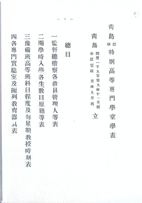 青岛德华大学1909年的学表(封面、目录以及所开设的交通类专业课程)