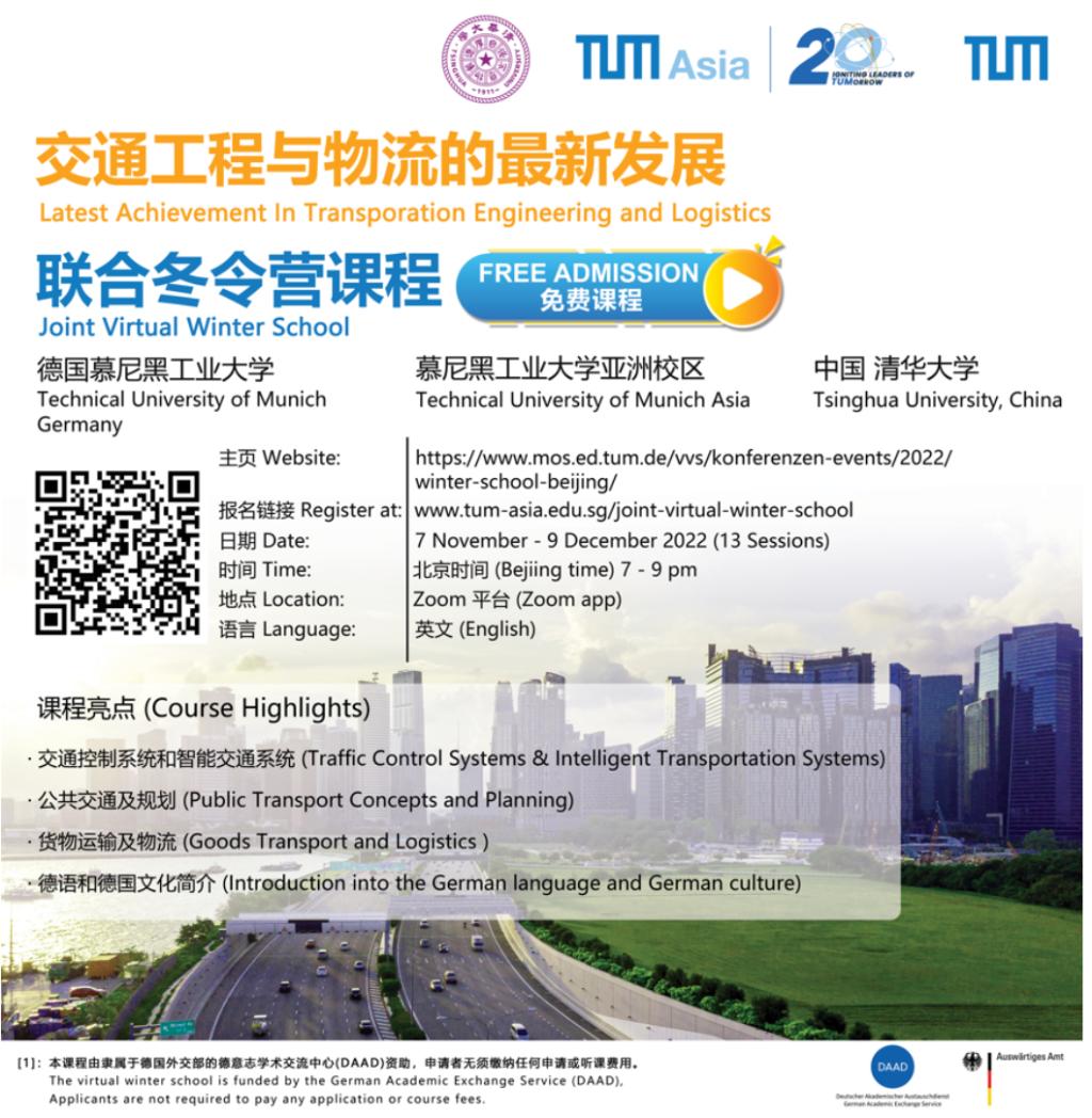 联合冬令营项目是由德国慕尼黑工业大学, 慕尼黑工业大学新加坡校区以及清华大学主办。所有课程均为英文授课。如果您对交通相关学科感兴趣,以及有兴趣攻读慕尼黑工业大学的交通专业硕士学位课程, 均可以报名参加此项目, 员工将有机会与慕工大的老师线上交流并讨论在慕工大的学习和研究机会。本项目由德意志学术交流中心(DAAD)资助, 申请者无需缴纳任何申请或课程费用。